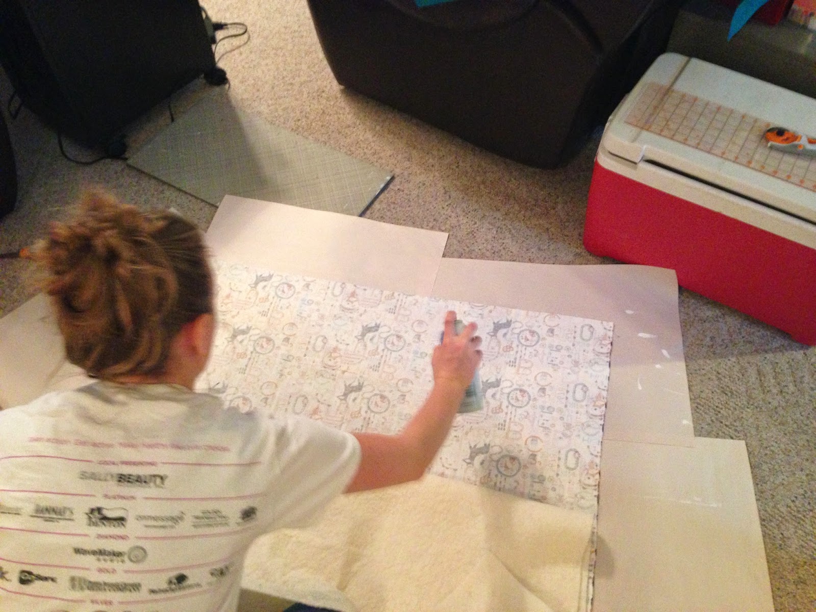 I fold back the top half carefully and spray the adhesive on the fabric.